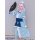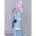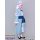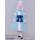 水色のポリエステル生地にて製作いたしました。襟元にはフリルと紺色のリボンをあしらいました。袖にも同様に可愛らしく大きめのフリルを縫い付けました。前身頃の首元から裾にかけて伸びるフリルは腰の位置でめくれるので、下のスカートがちらりと見える仕様となっております。前身に咲いたピンクの花弁模様はプリントです。襟元のスナップボタンにて着用して頂きます。裏地付きです。